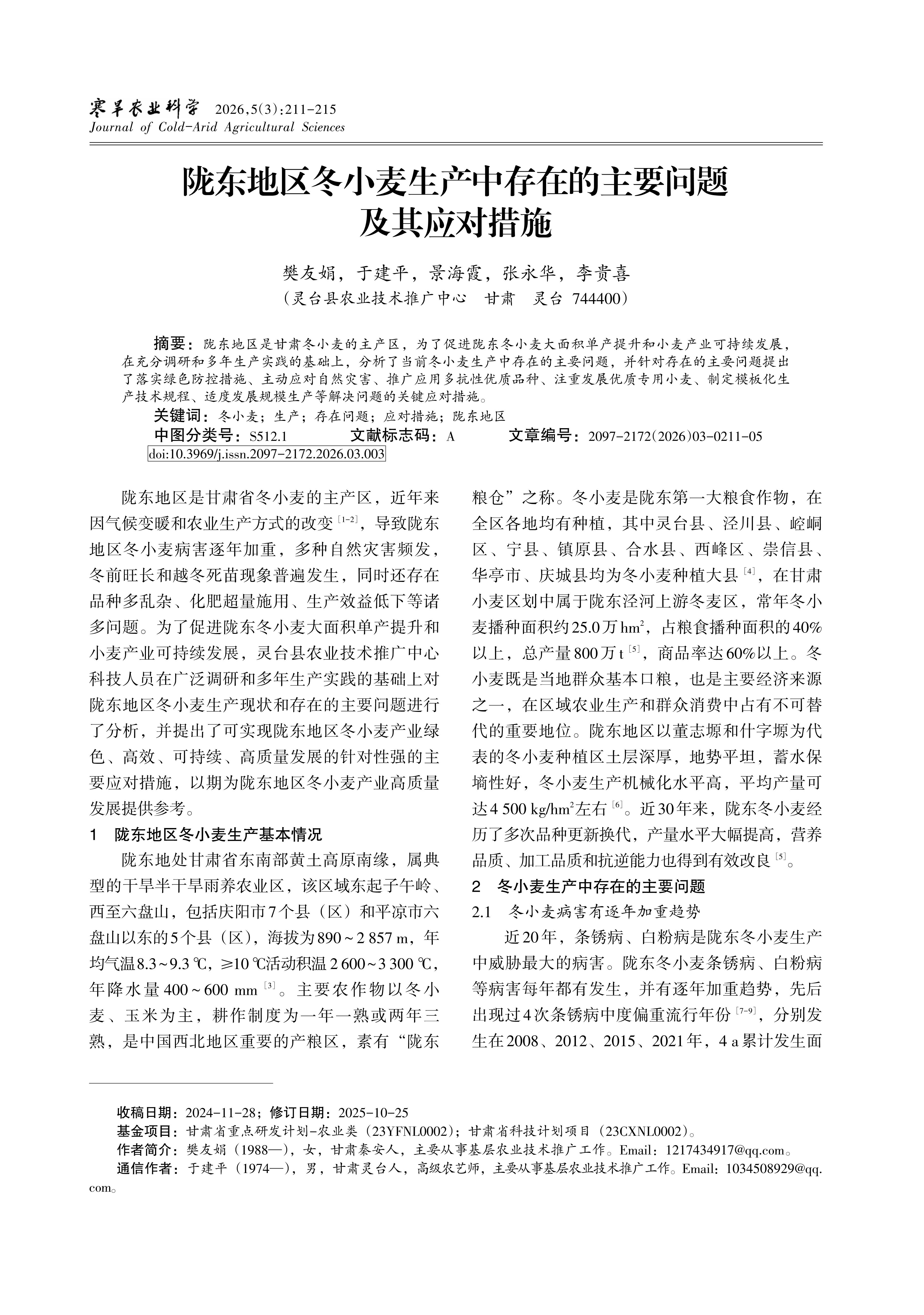 Longdong is a major production area of winter wheat in Gansu Province. To promote large-scale yield improvementof winter wheat and to ensure the sustainable development of the wheat industry in this region, this study analyzes the main issues ex.isting in winter wheat production based on comprehensive investigation and years of production practices. Targeted countermeasuresare proposed, including implementing green prevention and control measure, actively responding to natural disaster, promoting the ap.plication of high-quality variety with multiple resistance, emphasizing the development of high-quality special-purpose wheat, formu.lating standardized production technical specification, and moderately developing large-scale production. These measures aim to pro.vide important guidance for improving winter wheat productivity and promoting sustainable agricultural development in Longdong.